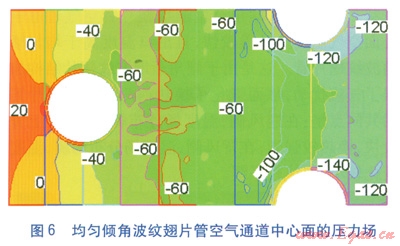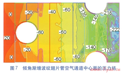 空氣進口速度為4m/s時,兩種波紋翅片管空氣通道中心面的壓力(表壓)場分別見圖6、7,圖中數(shù)值單位為Pa。由圖6、7可知,兩種波紋翅片管的壓力分布均比較紊亂。傾角漸增波紋翅片管空氣通道中心面的壓力降要大于均勻傾角波紋翅片管,且隨著翅片傾角的增大,等壓線分布更加稠密。原因是傾角漸增波紋翅片結(jié)構(gòu)對流體的阻滯和擾動作用都較大,阻力比均勻傾角波紋翅片管大。