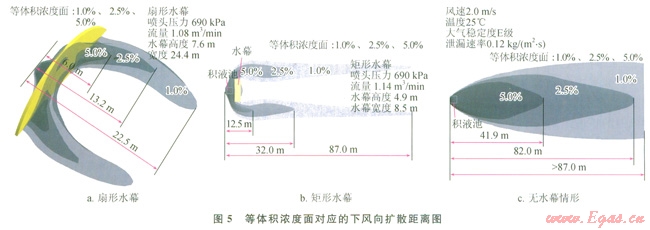 下面對(duì)扇形水幕的參數(shù)進(jìn)行研究,包括噴水量和水幕和擴(kuò)散源之間的間隔,這二者是影響水幕阻擋效果的主要因素。圖7顯示了不同水流量下,水幕對(duì)氣體擴(kuò)散的影響,在相同的大氣條件下,水流量越大,形成的水幕尺寸也就越大。當(dāng)扇形水幕流量為l.32m3/min,壓力1035kPa時(shí),水幕高度為11.4m,寬度45.6m,LNG蒸發(fā)氣體下風(fēng)向擴(kuò)散的安全距離為8.3m。