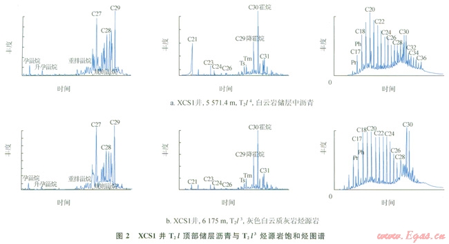 1)氣源分析發(fā)現(xiàn),川西坳陷T2l頂部風(fēng)化殼氣藏氣源主要來自于T2l渦湖相的“富藻碳酸鹽巖烴源巖”:CKl井3個(gè)氣樣分析結(jié)果顯示,T2l滅然氣中含H2S,(H2S含量介于0.39%~0.68%),天然氣碳同位素值有別于陸相上三疊統(tǒng)須家河組和侏羅系,表現(xiàn)出典型的油型氣特征;同時(shí),XCSl井T2l頂部?jī)?chǔ)層瀝青與蒸發(fā)巖之下“富藻碳酸鹽巖烴源巖”生物標(biāo)記化合物特征表現(xiàn)出很高的相似性,均具有低孕甾烷、規(guī)則甾烷呈“V”形、三環(huán)萜烷含量小于五環(huán)萜烷、色譜呈雙峰的特征(圖2)。