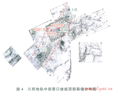 伴隨印支中晚期以來龍門山造山帶的隆升推覆、多期次由西向東強(qiáng)烈擠壓,使川西地區(qū)雷頂風(fēng)化殼層還受到了構(gòu)造裂縫及由構(gòu)造形變而產(chǎn)生的熱液流動(dòng)等因素的影響,重新形成在深埋條件下的“孔縫洞體系”。目前,在川西坳陷中部,用三維地震曲率法預(yù)測(cè)出在雷頂風(fēng)化面上明顯發(fā)育一組NE走向、寬約20km、長(zhǎng)約75km、裂縫密度達(dá)22.33條/km2的網(wǎng)狀裂縫帶,裂縫向上延伸到小塘子組,向下延伸到雷四中下亞段,平面主要集中在文星、玉泉、新場(chǎng)、馬井一線(圖4)。分析認(rèn)為這組裂縫帶主要形成于印支晚期構(gòu)造運(yùn)動(dòng),裂縫帶發(fā)育與構(gòu)造形變及層內(nèi)膏鹽巖的塑性揉皺有關(guān),其可能對(duì)雷頂風(fēng)化殼巖溶儲(chǔ)層發(fā)育及溝通下伏層內(nèi)烴源起著十分重要的作用,CK1井和XCSl井發(fā)現(xiàn)的風(fēng)化殼氣藏都位于裂縫發(fā)育帶內(nèi)。