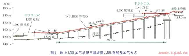 儲(chǔ)氣罐布置于岸上,安全可靠性強(qiáng);有現(xiàn)行國家規(guī)范作為設(shè)計(jì)、施工依據(jù);岸上LNG卸氣與船上LNG加氣可同時(shí)進(jìn)行,LNG加氣時(shí)間不受影響,充分滿足加氣船舶的需求;岸上LNG儲(chǔ)存設(shè)施可預(yù)留位置,加氣規(guī)模有發(fā)展余地;架空斜坡道長度短,施工工期略短,對通航行洪影響小;造價(jià)較低。