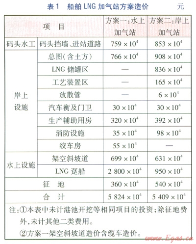 結(jié)合上述水上LNG加氣站方案、岸上LNG加氣站方案的建設(shè)內(nèi)容,對兩個(gè)方案進(jìn)行技術(shù)經(jīng)濟(jì)比較。船舶LNG加氣站方案造價(jià)見表1。