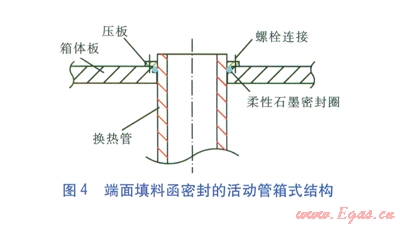 為降低成本,經(jīng)過分析研究,決定選用抗腐蝕性能高且價格低的復(fù)合管材——20號鋼管外表面鍍搪瓷,采用端面填料函密封的活動管箱式結(jié)構(gòu)(見圖4)。