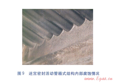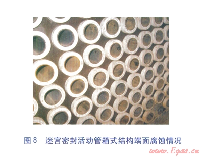 經(jīng)研究,認為采用非金屬材料的迷宮密封結(jié)構(gòu)可以有效消除縫隙腐蝕的發(fā)生,迷宮密封活動管箱式結(jié)構(gòu)見圖7。鍍搪瓷鋼管穿入迷宮密封套中(內(nèi)環(huán)面加工有迷宮鋸齒槽),迷宮鋸齒槽與鋼管外表面形成若干道迷宮腔,從而實現(xiàn)了密封。迷宮密封活動管箱式結(jié)構(gòu)不但具有端面填料函密封的活動管箱式結(jié)構(gòu)的優(yōu)點,還由于換熱管與箱體板之間有柔性迷宮密封套隔離,避免了在安裝、運行過程中對搪瓷層的破壞,從本質(zhì)上消除了縫隙腐蝕的發(fā)生[5]。經(jīng)技術(shù)改造后的空氣預(yù)熱器,連續(xù)運行2年后運行狀況依然良好,箱體板及換熱管各部位基本上沒有發(fā)生腐蝕(見圖8、9)。