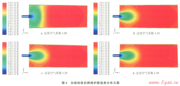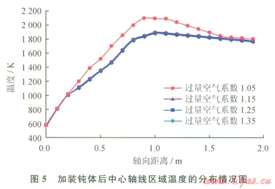 增加鈍體可以有效增加燃燒器出口的回流區(qū)域,使燃燒產(chǎn)生的高溫炯?xì)饣亓?,增加燃燒的穩(wěn)定性,提高燃燒效率,同時還能有效提高爐膛溫度的均勻性。圖5為在燃燒器出口加裝鈍體后的中心軸線區(qū)域溫度分布情況,圖6為燃燒爐膛溫度分布云圖。