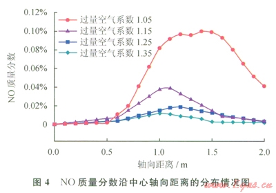 圖4為N0質(zhì)量分?jǐn)?shù)沿中心軸向距離的分布情況,由圖4可知,a為1.05時,NO的峰值最大,其質(zhì)量分?jǐn)?shù)達(dá)到0.11%,結(jié)合圖2的溫度分布可知,當(dāng)a為1.05時,具有最高的溫度峰值,較高的溫度會促使熱力型NO的生成量增加;a為1.15時,NO的峰值為0.018%;a為1.25時,NO的峰值為0.039%;a為1.35時,NO的峰值為0.012%,可以看出NO的生成量與燃燒工況的溫度有較大的關(guān)系。NO的質(zhì)量分?jǐn)?shù)隨著軸向距離的增加呈現(xiàn)出先增后減的趨勢,如a為1.05時,在X為1.0~1.6m區(qū)間NO的質(zhì)量分?jǐn)?shù)最高,結(jié)合圖2可知該區(qū)間具有較高的溫度分布。4種過量空氣系數(shù)下爐膛出口處NO的質(zhì)量分?jǐn)?shù)分別為0.0427%,0.00218%,0.000996%,0.000254%,從減少污染物排放的角度考慮,工況4(a為1.35)是最優(yōu)的,產(chǎn)生的NO含量最低。