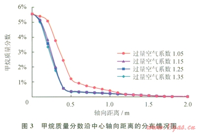 圖3反映了甲烷質(zhì)量分?jǐn)?shù)沿中心軸向距離的分布情況。在爐膛的尾部,甲烷的質(zhì)量分?jǐn)?shù)都幾乎為0,4種工況的甲烷轉(zhuǎn)化率都超過99.8%,其中,a為1.15、1.25、1.35這3種工況下的甲烷質(zhì)量分?jǐn)?shù)變化最快,到X為0.60m處就幾乎燃盡,容易在燃燒器根部形成高溫區(qū)域;a為1.05時,甲烷質(zhì)量分?jǐn)?shù)下降相對緩慢,在0.60m處達(dá)到1.2%。