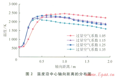 在過量空氣系數(shù)(d)分別為1.05、1.15、1.25和1.35這4種工況下,爐膛燃燒區(qū)域溫度沿中心軸向距離(X)為0~2.0m(取燃燒器擴(kuò)散噴口出Vl為X=0的位置)的分布如圖2所示。