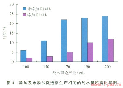 為了更清楚地了解Rl41b促進劑對CO2水合物海水淡化效率的影響,筆者對比了兩組實驗的相同理論純水產(chǎn)量所需的時間,結果見圖4。從圖4中可看出,生產(chǎn)相同量的純水,不添加Rl41b的實驗所需時間為添加Rl4lIJ的2~4倍。