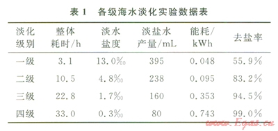 本研究選用的是青島周邊海域的海水,其鹽度為29.5‰±0.5‰。筆者共進行了四級海水淡化實驗,表1為一到四級海水淡化的實驗數(shù)據(jù)。由表1中數(shù)據(jù)可知,隨著淡化級數(shù)的不斷增加,淡化水的鹽度不斷降低,從一級淡化水的l3.0‰,到四級淡化水的0.3‰;相應地,去鹽率從一級淡化水的55.5%,到四級淡化水的99.0%,淡化水產(chǎn)量卻從395mL降到了80mL。三級淡化是收集所有的二級淡化水后進行的,而四級淡化則是收集三次淡化水后進行的。因此,其整體能耗及時間應該累加,可以看出,雖然三級淡化和四級淡化所得到的淡化鹽度較低,但是,所需要的時間和能耗也非常高,四級淡化水需要時間為33h,能耗達到了0.743kWh。