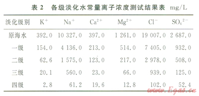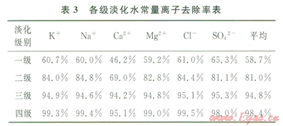 2)對本方法的海水淡化程度進行了分析,海水經(jīng)過多級淡化,可以獲得了凈化度很高的淡水。在二級淡化水中,常量離子去除率平均可達81.0%,而三級和四級淡化水的離子去除率則分別達到了94.8%和98.4%,四級淡化水所有的離子濃度指標均優(yōu)于飲用水標準。