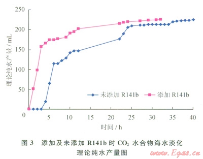 在相同條件下,CO2壓力降低越快,說明CO2水合物反應速度越快。對照兩組相同的實驗發(fā)現(xiàn),添加了Rl41b的實驗比未添加Rl41b的實驗壓力降低的速度明顯加快,如當CO2壓力都降為3.7MPa時,前者所需時間為2h,而后者則需要8h,說明了添加R141b可極大地促進CO2水合物的生成速度,從而提高海水淡化效率。