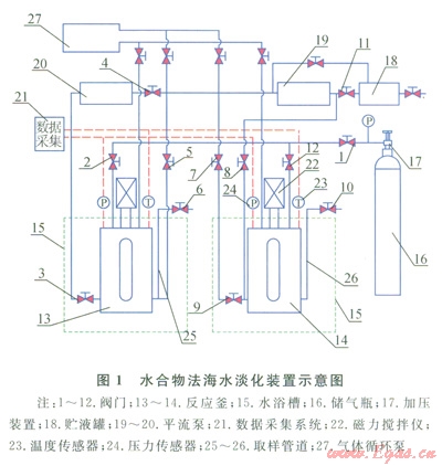 為此,筆者研制了一套水合物法海水淡化實驗裝置[7],采用雙反應釜設計,兩釜之間氣體、液體可以相互流通,可開展海水的逐級淡化研究。首次將Rl41b作為促進劑與CO2氣體結合起來,大大加快了反應速度,探討了水合物法海水淡化操作的最佳條件,以期為該技術的工業(yè)應用提供依據(jù)。