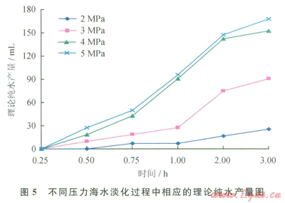 反應壓力與理論純水產(chǎn)量的關系見圖5。由圖5可看出,理論純水產(chǎn)量隨著壓力的升高而不同程度地升高。4MPa環(huán)境壓力的純水產(chǎn)量較2MPa、3MPa有明顯升高,雖然5MPa的純水產(chǎn)量為最高,但是效果與4MPa環(huán)境壓力相差不大。從實驗中可知,環(huán)境壓力4MPa左右可獲得較高的海水淡化效率,同時成本也不會太高。考慮到海水深度可提供1MPa左右的環(huán)境壓力。因此,可選定CO2氣體的初始壓力為3~4MPa.
