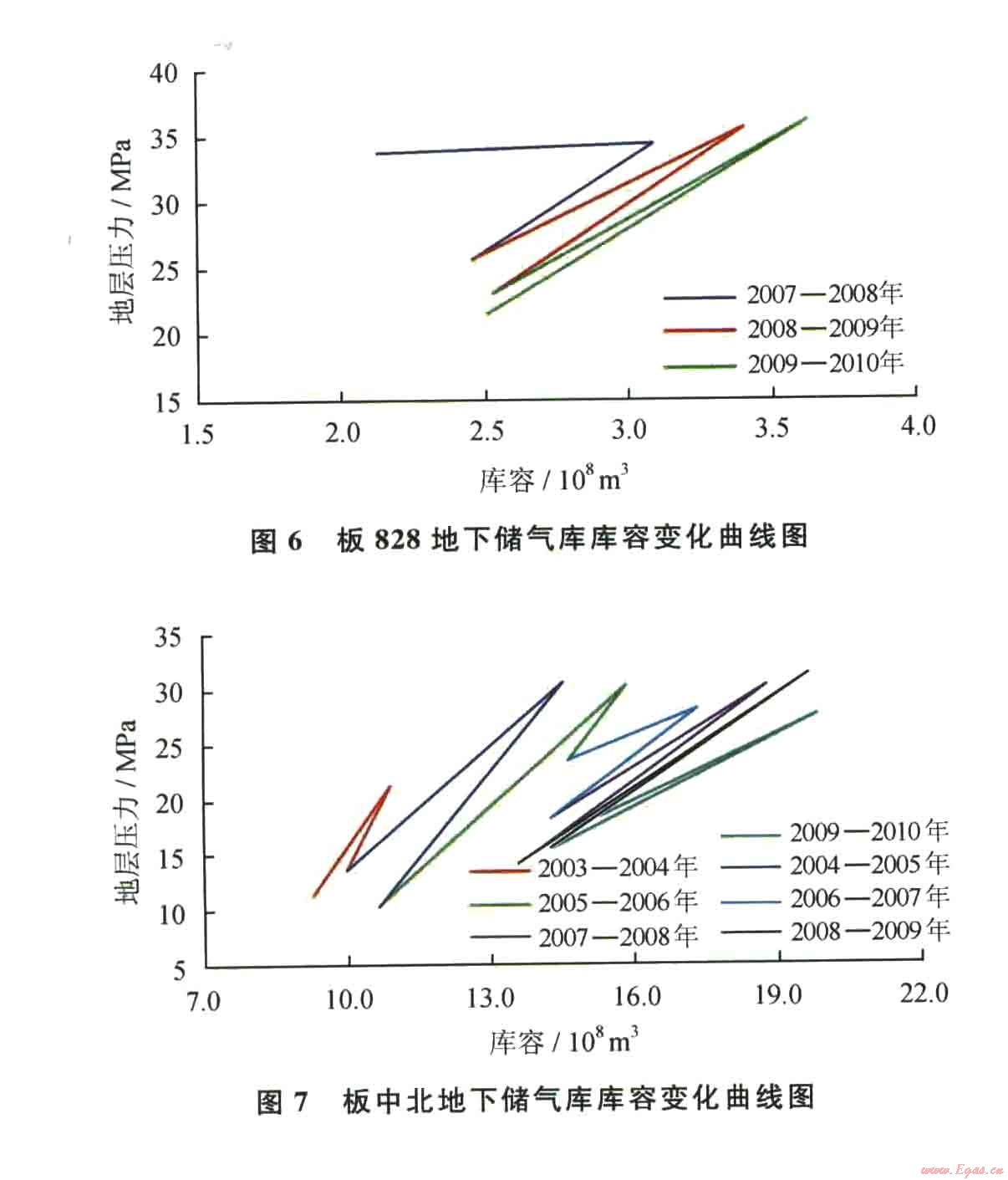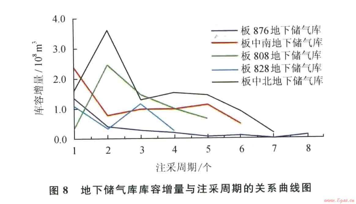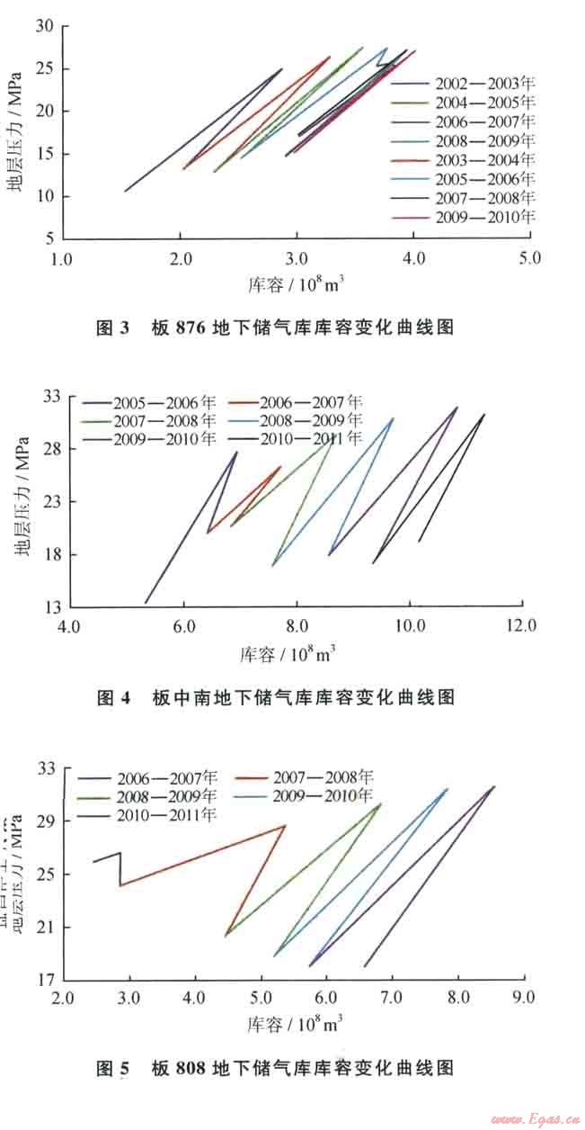 1)地下儲氣庫庫容量呈現(xiàn)逐漸增加的趨勢,并最終趨于最大庫容量。以注氣期結(jié)束時的庫容量為地下儲氣庫的當期庫容量,采氣期結(jié)束時的庫容量為地下儲氣庫的當期墊氣量,庫容量與墊氣量之差即為當期工作氣量(采氣量)。從地下儲氣庫的實際庫容量變化曲線看(圖3~7),隨著地下儲氣庫注采周期的增加,庫容曲線普遍右移,地下儲氣庫庫容明顯增大,而且注采周期越多,庫容增加愈多。板876地下儲氣庫運行5~8個注采周期時,庫容變化曲線基本重疊,表明地下儲氣庫已達到最大庫容量。由此也說明地下儲氣庫達容是一個長期的過程。從已建地下儲氣庫的達容特征看,水淹型地下儲氣庫的達容周期超過5年。