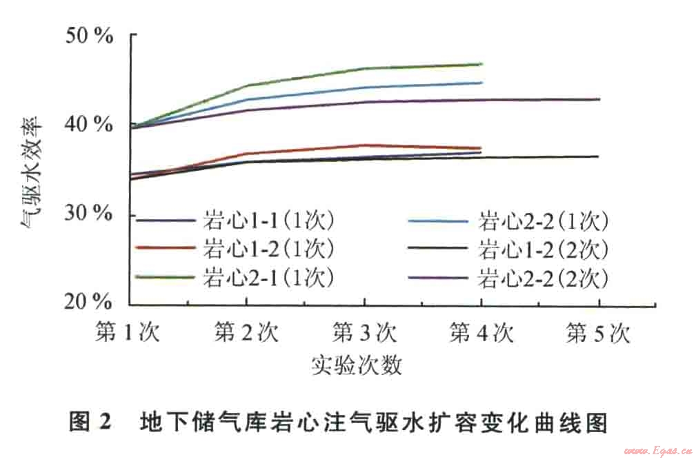 實驗結(jié)果揭示:地下儲氣庫內(nèi)的含水區(qū)可以實現(xiàn)較高的氣體驅(qū)替,4塊巖心的氣驅(qū)試驗壓力降落區(qū)間為地下儲氣庫原始壓力的100%~29%時,第l次氣體驅(qū)替效率可達到34%~40%,第2、3次累加氣驅(qū)效率可達36%~46%;地下儲氣庫實際注采生產(chǎn)過程中隨多周期的注采驅(qū)替,氣驅(qū)水達容效率是逐步增加的過程,或者說若要實現(xiàn)地下儲氣庫較高的氣體驅(qū)替效率,則需要多年的注采周期。
