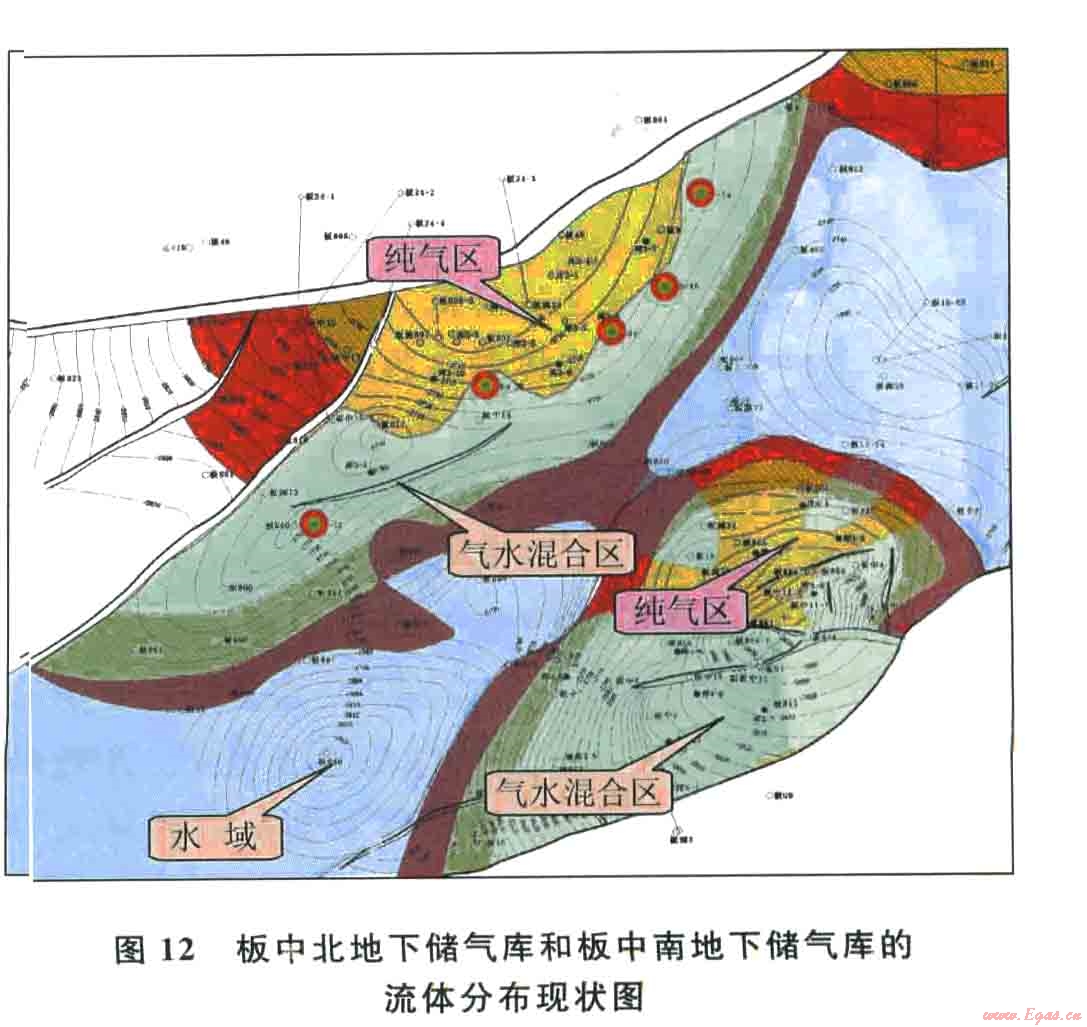 地下儲氣庫的構(gòu)造特征影響著達容的速度。對于完整的背斜或單斜構(gòu)造型地下儲氣庫,邊部水體在建庫前的氣藏開采階段,由低向高的水侵結(jié)果通常使低部位含水多高部位含水少,流體分布遵循上輕下重的重力分異規(guī)律。當?shù)叵聝鈳觳扇∮筛呦虻偷淖怛?qū)水達容方案時,這種規(guī)律性表現(xiàn)得更突出,這是由實踐證實的普遍性規(guī)律。板中北高點地下儲氣庫7個注采周期后的流體分布狀態(tài)如圖l2所示。對于內(nèi)部存在較多斷層的破碎型地下儲氣庫,由于斷層的阻隔作用,只能形成局部性的小單元注氣驅(qū)水達容過程,通常由于范圍小、井數(shù)少,無法實現(xiàn)高部位注氣向低部位驅(qū)水的理想過程,造成小單元內(nèi)氣水分布混雜、驅(qū)水達容效果差,進而影響到整個地下儲氣庫驅(qū)水達容的效果。如板中南地下儲氣庫整體形態(tài)為一背斜構(gòu)造(見圖12),但由于內(nèi)部發(fā)育有5條小斷層,造成多個小單元自成系統(tǒng),難以實現(xiàn)完善的氣體驅(qū)水注采關(guān)系,影響了達容效率,延長了達容時問。板中南地下儲氣庫5個注采周期后的流體分布狀態(tài)如圖l2所示。