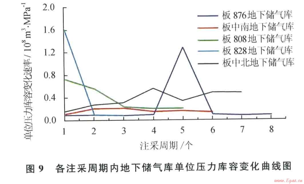 盡管地下儲氣庫的達容過程具有前快后慢的特點,但地下儲氣庫從第2注采周期開始,單位壓力下庫容的變化量即彈性庫容率卻基本維持在一個穩(wěn)定值,盡管不同地下儲氣庫的該數(shù)值不同,但同一地下儲氣庫彈性庫容率基本穩(wěn)定的規(guī)律相同。地下儲氣庫單位壓力庫容變化曲線圖9所示。同理,在圖3~7中每個地下儲氣庫不同注采周期的曲線斜率也基本相同,反映每一個地下儲氣庫在壓力運行區(qū)間內(nèi)單位壓力變化所波及的有效孔隙空間容積基本不變。由此推測,實際上地下儲氣庫內(nèi)的氣水與地下儲氣庫外部的弱水體總體上組成了同一氣水系統(tǒng),類似于定容氣水系統(tǒng)的特征。以板876地下儲氣庫為例,在地下儲氣庫生產(chǎn)運行的8個注采周期中,除第5注采周期生產(chǎn)管理因素外,其余各注采周期的彈性庫容率基本相同,無論庫容增速快慢或庫容量大小變化,但彈性庫容率卻基本不變。但板中北地下儲氣庫卻是個特例,其具有較強的邊部水體,在地下儲氣庫生產(chǎn)運行的7個注采周期中,隨著注采周期增加庫容量逐漸增大,同期彈性庫容率也逐漸增大,反映了強邊水地下儲氣庫的庫容率變化規(guī)律。