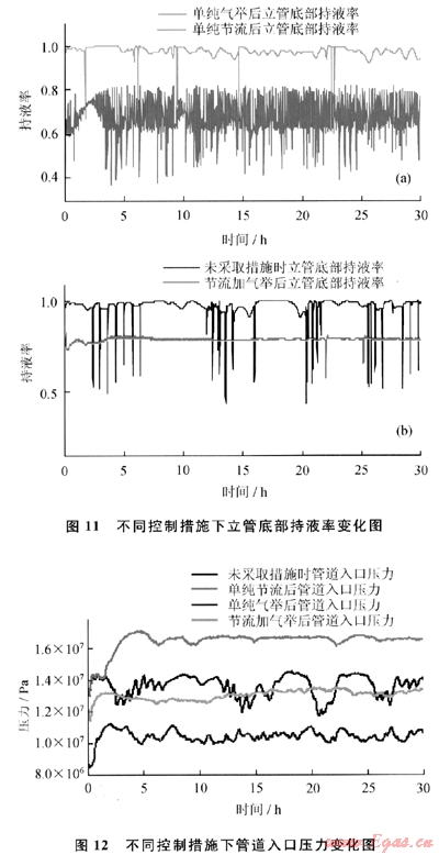 4)從模擬結(jié)果看,采取節(jié)流加氣舉法控制段塞流效果比單純節(jié)流或單純氣舉效果都更好,但提高油氣產(chǎn)量的效果不及單純氣舉法。當(dāng)氣舉氣源不是很充足時(shí),可予以考慮。