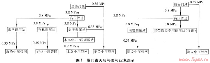 廈門市液化天然氣利用工程于2008年1月全面開工建設(shè),是福建省LNG工程總體項目的9個子項目之一。2010年建設(shè)規(guī)模為年供氣1.5568×108m3/a,最大供氣量為53.4×104m3/d,供應(yīng)居民用戶約30.9×104戶。該工程主要分為兩部分:a.天然氣高中壓輸配系統(tǒng)。建設(shè)門站2座(集美門站、翔安門站)、高-中壓調(diào)壓站4座(東孚調(diào)壓站、杏林調(diào)壓站、集美調(diào)壓站、同安調(diào)壓站)和中-中壓調(diào)壓站1座(本島調(diào)壓站);敷設(shè)高壓輸氣管道27.78km,中壓輸氣管道12.22km,中壓輸配管道488.45km。工程總造價達(dá)6.28×108元。b.置換和發(fā)展天然氣用戶62×104戶。廈門市天然氣供氣系統(tǒng)流程見圖1。