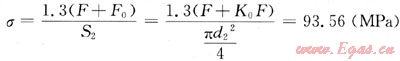 式中F0為螺栓殘余鎖緊力,F(xiàn)0=K0F,N;K0為殘余鎖緊系數(shù),《機械設(shè)計基礎(chǔ)》建議K0為1.5~1.8,取K0=1.8;S2為螺栓螺紋小徑處橫截面積,mm2;d2為螺栓螺紋小徑,取d2=mm。