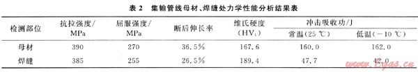 在四川某集輸管線上截取試樣分別按照國家標(biāo)準(zhǔn)進(jìn)行理化性能試驗(yàn),管線母材和焊縫的化學(xué)成分、力學(xué)性能綜合測(cè)試結(jié)果見表1、2。