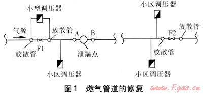 燃氣管道的修復見圖1。修復作業(yè)開始前,做好以下準備工作:①在泄漏點兩側管道上各鉆1個工作孔(A、B)并裝上閥門備用,一般要求工作孔距泄漏點不小于500mm,孔徑為4mm或50mm。②將F1閥門兩側的放散管相連,并在連接處安裝小型調壓器。當泄漏管段壓力較低時,利用小型調壓器補氣,控制泄漏管道內的壓力,保證不放空管道形成負壓,而且要在低壓管網(wǎng)壓力低于588Pa時對各小區(qū)進行補氣。