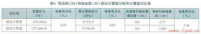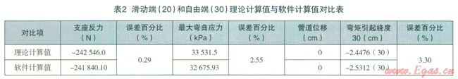 通過對兩種應(yīng)力計算結(jié)果的比較和誤差分析,很容易從上面列表中看出:理論計算值與軟件計算值中誤差最大者,即由管線自重引起的支座反力偶和最大彎曲應(yīng)力。這是由于軟件在計算過程中采用迭代法,而在理論計算中忽略了各投影面力矩之間互相關(guān)系的二次項,從而造成兩者之間的誤差。因管線自重對整個管線應(yīng)力情況的影響最小,我們在進(jìn)行管線應(yīng)力分析時主要考慮的管線影響因素就是溫度和內(nèi)壓。