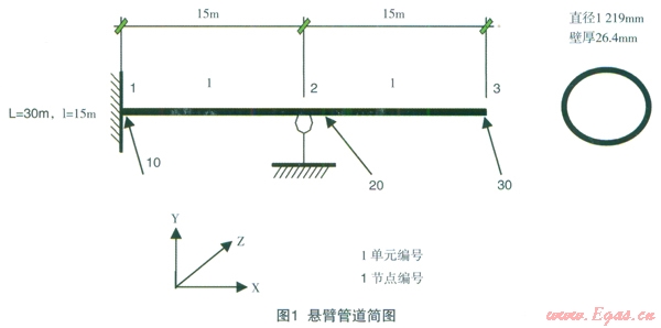 大口徑、厚壁管道,是指鋼管外徑和壁厚之比小于20的鋼管,廣泛應(yīng)用于自來水、天然氣、石油、化工、醫(yī)藥、通訊、電力、海洋工程等領(lǐng)域。其應(yīng)力分析主要是為了滿足管道設(shè)計強度和柔性要求,確保管道在各種工況下安全運行,而載荷是導(dǎo)致管道內(nèi)產(chǎn)生應(yīng)力的基本原因。大口徑、厚壁管所受的載荷按照載荷性質(zhì)可分為靜載荷、動載荷和溫度載荷。為了便于分析,本文只研究管道所受的靜載荷,即對大口徑、厚壁管進(jìn)行靜力分析。該類管道的靜力分析主要有3類:一是壓力載荷和持續(xù)載荷作用下的管道一次應(yīng)力計算,為防止塑性變形破壞;二是管道熱脹冷縮以及端點附加位移載荷作用的管道二次應(yīng)力計算,為防止疲勞破壞;三是管系位移計算,為防止管道碰撞和支吊點位移過大。由于管路沿線的地貌復(fù)雜,引起管道應(yīng)力的因素較多,針對大口徑、厚壁管的應(yīng)力分析,我們主要考慮管系自重、內(nèi)壓和溫度3大要素。下面將以大口徑、厚壁管中的懸臂管道為例,對CAESARⅡ軟件應(yīng)用于這類管道的應(yīng)力分析作可行性研究。