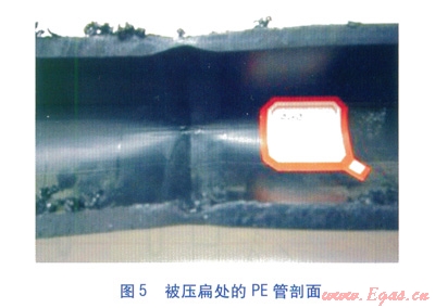 2011年1月,在對de63mm規(guī)格PE管進(jìn)行壓扁阻斷作業(yè)過程中發(fā)現(xiàn),PE管的復(fù)原情況不理想。隨即,我們對壓扁處PE管進(jìn)行切割,發(fā)現(xiàn)PE管內(nèi)壁損傷嚴(yán)重,壓扁處出現(xiàn)明顯減薄并出現(xiàn)裂紋,被壓扁處的PE管剖面見圖5。