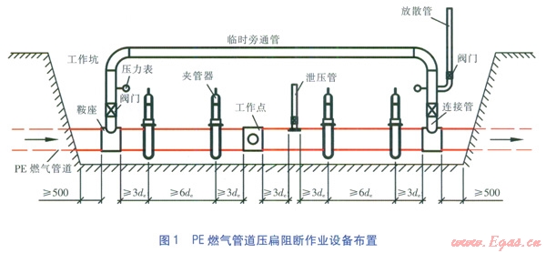 壓扁阻斷作業(yè)涉及的設(shè)備較多,加之夾扁影響區(qū)有一定長度,因此對各種設(shè)備的間距有一定要求(見圖l),而且工作坑長度須滿足各種設(shè)備的間距要求。