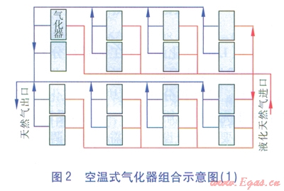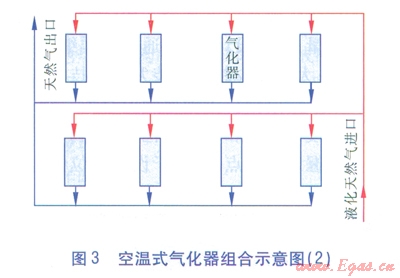 空溫式氣化器的臺(tái)數(shù)和氣化量,可跟據(jù)工程建設(shè)規(guī)模和用戶的要求綜合確定??諟厥綒饣鹘M合示意見(jiàn)圖2、3。