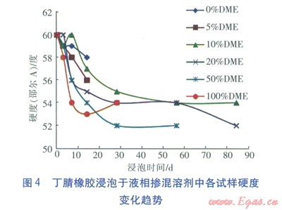 ①液相摻混溶劑對(duì)丁腈橡膠的硬度影響較小;總體上隨著浸泡時(shí)間的增長(zhǎng),硬度有所減小。