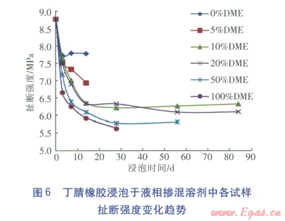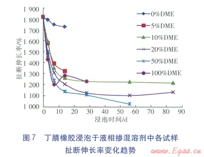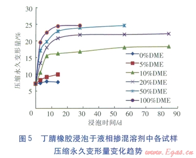 ③丁腈橡膠是一種合成橡膠,屬交聯(lián)聚合物,它在二甲醚摻混液中的溶脹都屬于有限溶脹。液相摻混液對(duì)丁腈橡膠的腐蝕,主要發(fā)生在浸泡的前10d左右的時(shí)間里,之后溶脹現(xiàn)象都趨于平穩(wěn)。