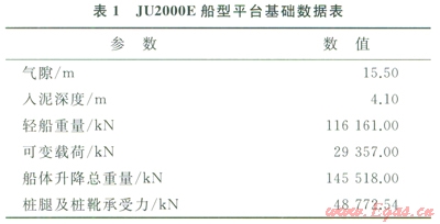 以現(xiàn)今主流的400Ft自升式JU2000E船型為基礎(chǔ)建立等效有限元模型,選取我國東海黃巖海域為模擬環(huán)境海區(qū),平臺自身性能參數(shù)如表l所示,海區(qū)環(huán)境參數(shù)基本數(shù)據(jù)如表2所示。
