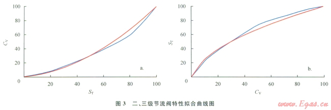 繪制擬合曲線和線性化補(bǔ)償反函數(shù)曲線(圖3)。二級節(jié)流閥開度(ST)與流量系數(shù)(CV)存在圖3-a藍(lán)色曲線所示關(guān)系,曲線表明兩者關(guān)系非線性比較嚴(yán)重,不利于流量均勻準(zhǔn)確控制,必須進(jìn)行線性化,以達(dá)到智能線性解耦控制。
