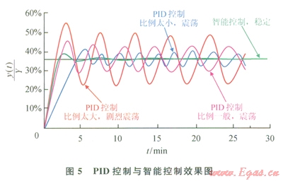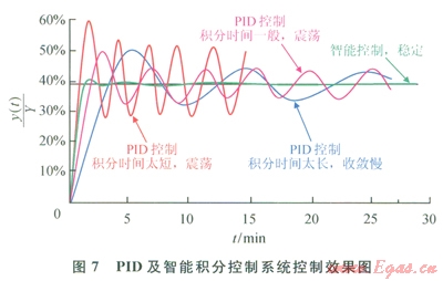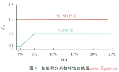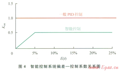 可見,采用智能控制,可使偏差快速穩(wěn)定收斂,當(dāng)[å|e(t)|/n]/Yset≥5%時(shí),采用固定比例控制,當(dāng)[å|e(t)|/n]/Yset≤5%時(shí),采用一定時(shí)間(大約0.5個(gè)波動周期)相對偏差絕對值的均值(10/Yset)[ å|e(t)|/n]作為改變控制量的隨機(jī)變動系數(shù),智能系數(shù)Kint,與E(t)在5%以下時(shí)呈線性遞增關(guān)系,控制量u(t)與E(t)呈非線性遞增關(guān)系。