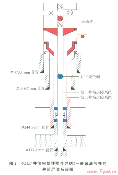 2)鑒于“深水地平線事件”教訓(xùn)和近年來(lái)環(huán)空帶壓的研究,《OLF井筒完整性推薦指南》將一般采油氣井的井筒屏障系統(tǒng)的第一安全屏障延伸到尾管部分,即尾管掛及尾管封隔器、尾管套管及固井,設(shè)置了多重屏障。