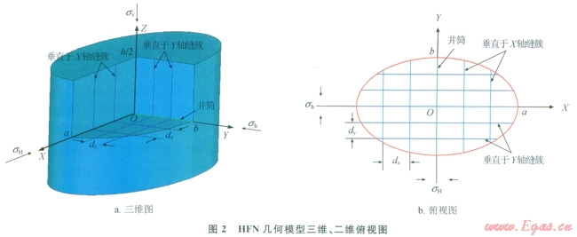 HFN模型基本假設(shè)如下:①壓裂改造體積為沿井軸對(duì)稱(chēng)2a×2b×h的橢柱體,由直角坐標(biāo)系XYZ表征,X軸平行于sH方向,Y軸平行于sh方向,Z軸平行于sv方向;②將縫網(wǎng)等效成兩簇分別垂直于X軸、Y軸的縫寬、縫高均恒定的裂縫,縫間距分別為dx、dy;③考慮流體與裂縫以及裂縫之間的相瓦作用;④不考慮壓裂液濾失?;谝陨霞僭O(shè),做出HFN模型的幾何模型示意圖(圖2)。