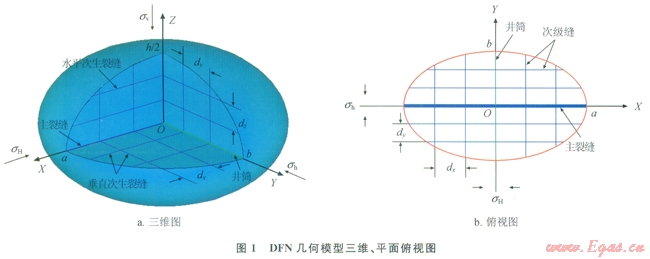 DFN模型基本假設(shè)如下:①壓裂改造體積為2a×2b×h的橢球體,由直角坐標(biāo)系XYZ表征,X軸平行于最大水平主應(yīng)力(sH)方向,Y軸平行于最小水平主應(yīng)力(sh)方向,Z軸平行于垂向應(yīng)力(sv)方向;②包含一條主裂縫及多條次生裂縫,主裂縫垂直于sh方向,在X-Z平面內(nèi)擴(kuò)展,次生裂縫分別垂直于X、Y、Z軸,縫間距分別為dx、dy、dz;③考慮縫間十?dāng)_及壓裂液濾失;④地層及流體不可壓縮?;谝陨霞僭O(shè),作出DFN模型幾何模型的示意圖(圖1)。