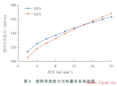 由圖6可知,隨著排量的增大,縫網(wǎng)導(dǎo)流能力增大;對(duì)于DFN模型,縫網(wǎng)導(dǎo)流能力從ll4mD·m增大至l63mD·m;對(duì)于HFN模型,縫網(wǎng)導(dǎo)流能力從106mD·m增大至169mD·m。當(dāng)流量低于l4m3/min時(shí),DFN模型計(jì)算的縫網(wǎng)導(dǎo)流能力偏大;當(dāng)流量高于l4m3/min時(shí),HFN模型計(jì)算值偏大。