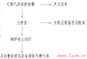 防爆場所的通風(fēng)一般有兩種方式:自然通風(fēng)、機(jī)械通風(fēng)。自然通風(fēng)由建筑專業(yè)設(shè)計考慮。機(jī)械通風(fēng)由暖通專業(yè)設(shè)計考慮。在燃?xì)忮仩t房內(nèi)設(shè)計可燃?xì)怏w濃度報警裝置和火災(zāi)報警裝置。可燃?xì)怏w濃度報警裝置按照可燃?xì)怏w爆炸下限20%設(shè)置報警點(diǎn),其控制過程如下: