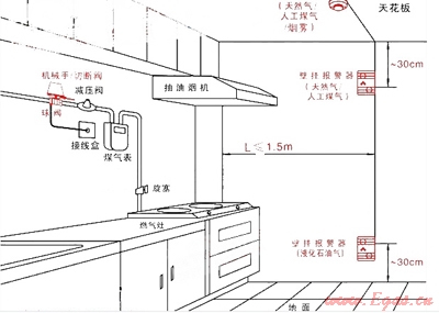 該探測(cè)器可以安裝在氣瓶輸出的瓶組間,也可以安裝在使用氣體的廚房間,如果是液化石油氣,氣體探測(cè)器安裝在離地面30公分處。(因?yàn)橐夯蜌獗瓤諝庵兀l(fā)生泄漏以后氣體下沉)使用天然氣就要安裝在天花板或則用氣設(shè)施的上方。探測(cè)器可以調(diào)整和設(shè)定燃?xì)鉂舛葓?bào)警數(shù)值。一般可以設(shè)定在15%,一旦氣體濃度達(dá)到15%。探測(cè)器,自動(dòng)輸出一個(gè)開(kāi)關(guān)信號(hào)??梢钥刂茩C(jī)械手動(dòng)作關(guān)閉多個(gè)進(jìn)氣閥門。同時(shí)可以控制開(kāi)啟防爆排風(fēng)扇工作。通過(guò)安裝的無(wú)線發(fā)射器,控制放置在收銀臺(tái)(可以保證長(zhǎng)期有人在場(chǎng))和廚房間的語(yǔ)音報(bào)警器發(fā)出:“氣體發(fā)生泄漏,已經(jīng)切斷了氣源。請(qǐng)立即派人處理。