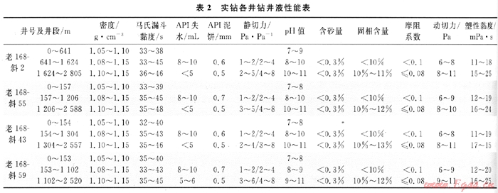 所采取的具體措施:①該叢式井組第一次開鉆采用老漿開鉆,小循環(huán)鉆進,向鉆井液中不斷補充天然高分子強抑制性包被絮凝劑(IND-30)及高分子包被絮凝劑(ZH-O2),利用高分子聚合物的絮凝作用及聚合物間的交聯(lián),協(xié)同能力提高鉆井液的抑制能力;②對于淺地層(平原組)大井眼定向的井(如老168-斜55、老168-斜43、老168-斜59井),當井斜達到30°左右時及時混入原油,并根據(jù)進尺情況加以補充,以提供足夠的潤滑性來降低摩阻及扭矩;③鉆進過程中保持足夠的排量(≥55L/s),充分清洗井眼攜帶巖屑;④鉆完第一次開鉆井深,用前井回收的老漿并加入2%的白油封裸眼井段,確保表層套管的順利下入。