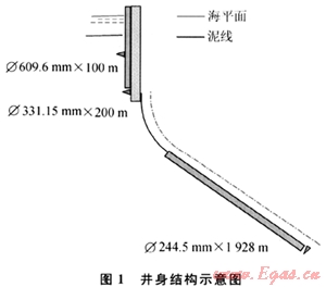 2) 井距很密,就要考慮表層預(yù)斜的方案。因此,在表層就要開(kāi)始造斜,確保后面鉆井作業(yè)的安全,此時(shí)采用鉆具組合一定要注意:①一定要使用牙輪鉆頭;②要采用彎接頭馬達(dá)和陀螺的組合;③要確保造斜率,使預(yù)造斜在淺層就要成功。所采用的鉆具組合為: