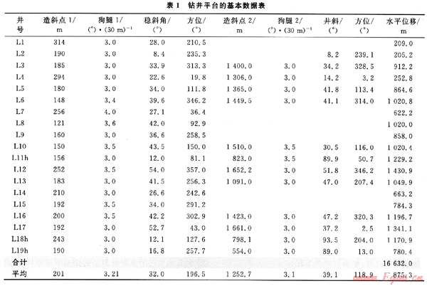 BH36油氣田經(jīng)過(guò)10多年的開(kāi)發(fā)[1],已經(jīng)形成了一套海上叢式井鉆井技術(shù)體系[2~3]且逐漸步入開(kāi)發(fā)的中后期,為有效提高剩余油氣的動(dòng)用程度,提高采收率,通過(guò)實(shí)施細(xì)致的油氣藏工程分析,決定在原來(lái)350m×350m的開(kāi)發(fā)井網(wǎng)中實(shí)施排狀加密。井口間距2.0m×2.0m,每個(gè)鉆井平臺(tái)總井?dāng)?shù)為16口,控制含油氣面積大約2km2,該油氣田垂深平均為1600m,平均井深在2000m左右。不難看出,在原井網(wǎng)中鉆再加密井網(wǎng)進(jìn)行調(diào)整是海上油氣田開(kāi)發(fā)所面臨的新課題。該區(qū)的井身結(jié)構(gòu)如圖1所示,平臺(tái)的基本數(shù)據(jù)如表1所示。