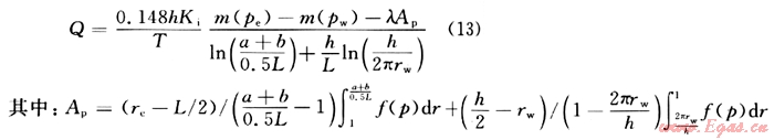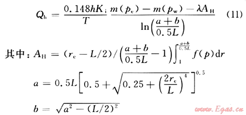 ,從而將長半軸為a、短半軸為b的橢圓形區(qū)域變換成半徑為(a+b)/(0.5L)的圓形區(qū)域,將線段(-L/2,0)到(L/2,0)映射成單位圓周在ξ平面內(nèi)的流動,可以認為是半徑(n+b)/(0.5L)的圓形供給區(qū)域內(nèi)有一口半徑為1的直井的情形。此時,水平平面上的啟動壓力梯度就變?yōu)椋?img src="/d/file/2d50a8431d038fbb7a18ec760af0c76d.gif" />,得水平井在水平面的流量為: