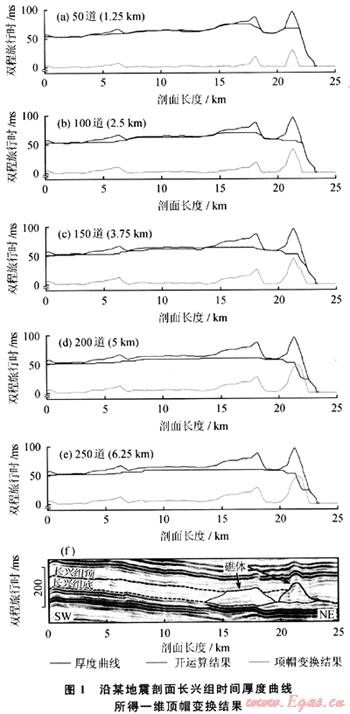 從幾何特征出發(fā),可以利用含礁體地層的厚度參數(shù)來刻畫礁體的分布。這需要在地震數(shù)據(jù)體上準(zhǔn)確地拾取含礁體地層的頂、底界面,然后計(jì)算出其間的厚度,據(jù)此推斷礁體的分布,其中厚度較大的區(qū)域是礁體的潛在分布區(qū)域。該方法原理簡單、易于操作,是定性判斷礁體分布的有效方法;其不足之處足只能大致圈定可能的礁體發(fā)育區(qū)域,不能定量地分離出各個(gè)孤立礁體的位置及分布范圍。筆者根據(jù)生物礁沉積厚度較同期非礁相地層大這一簡單的沉積地質(zhì)學(xué)原理。引入數(shù)學(xué)形態(tài)學(xué)中的頂帽變換方法,實(shí)現(xiàn)礁體分布的自動探測。