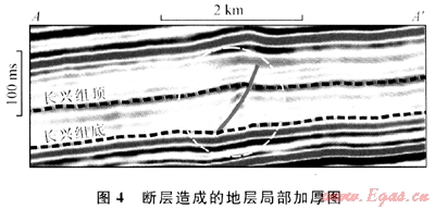 值得注意的是,在頂帽變換結(jié)果圖(圖3-a)上,其西南角有一長條狀高值異常區(qū)域,經(jīng)與地震剖面對比后確認(rèn)其為一小型逆斷層引起的地層局部加厚,并非礁體引起的厚度異常(圖4)。因此,頂帽變換預(yù)測的厚度高值異常區(qū),除了生物礁外,還可能為斷層等其他因素引起。