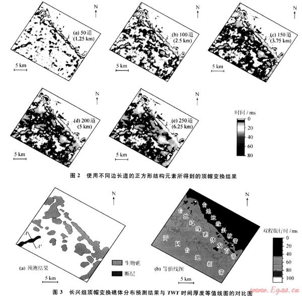 最終選取邊長為150道的結(jié)構(gòu)元素進(jìn)行頂帽變換,其結(jié)果如圖3-a所示。由該圖可知,研究區(qū)內(nèi)長興組總共發(fā)育有110多個(gè)礁體,礁體尺寸大小不等,小的數(shù)百米,大的逾5km;礁體主要分布于研究區(qū)中部,呈北西 南東向展布。這一結(jié)果與時(shí)間厚度圖(圖3-b)所揭示的規(guī)律相同,但直接根據(jù)厚度圖很難明確地區(qū)分出各個(gè)礁體的具體位置和分布范圍。